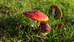 Wafje vindt het allemaal best en loopt lekker mee. Onderweg zien we nog een andere groep vliegenzwammen en S. gaat foto’s maken. Wafje wacht maar rent daarna toch keihard achter me aan.