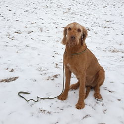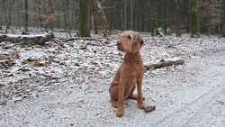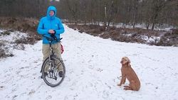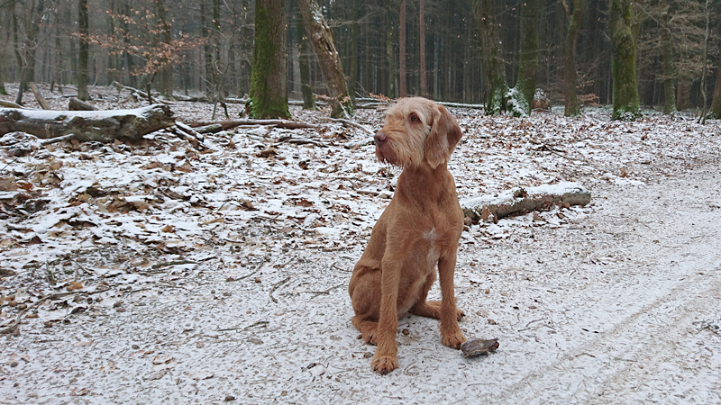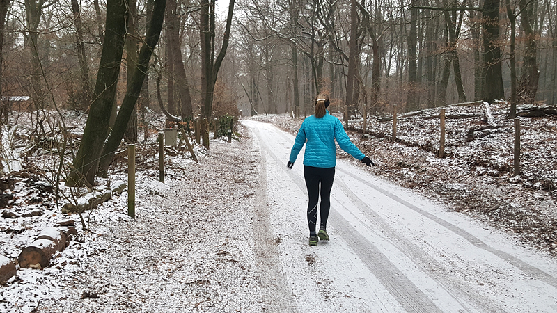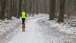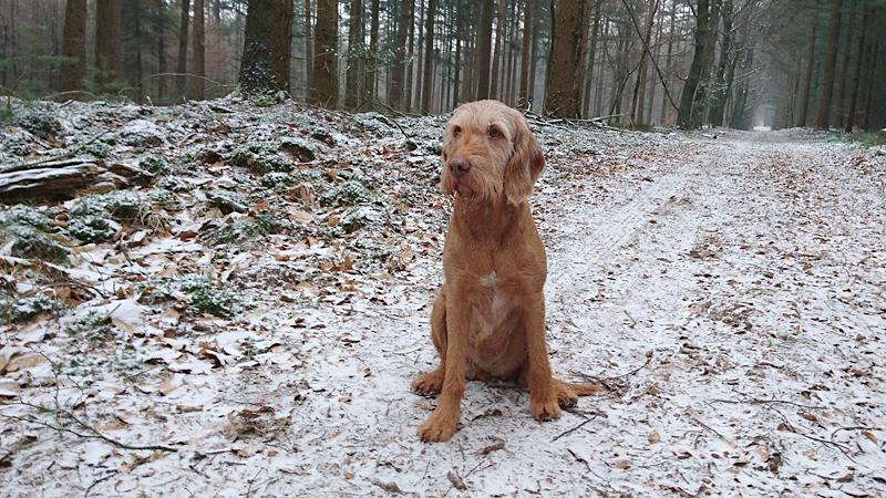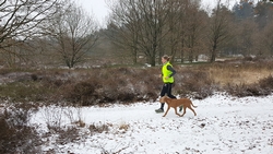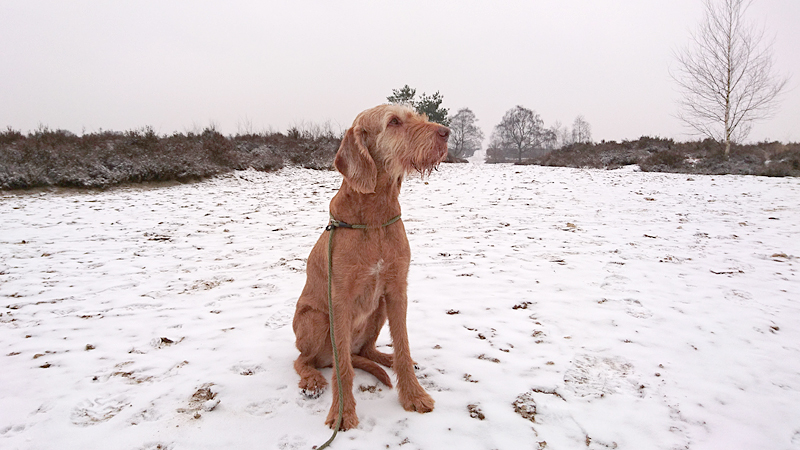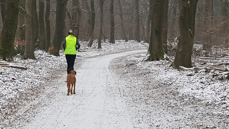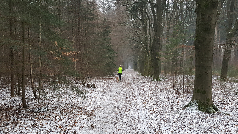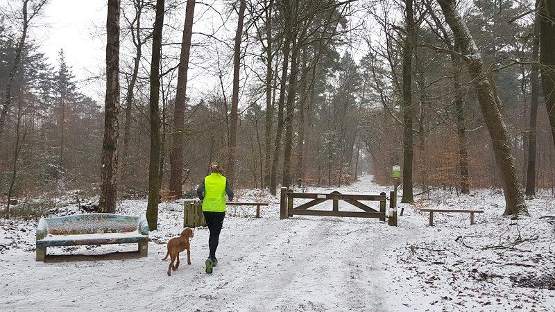 Gisteren liep ik maar een kort stukje dat nog lastig was vanwege de pekel op het pad. Ik koos toen voor onverharde stukken waar woef geen last van zou hebben. Vandaag gaan we naar Garderen om te lopen. Vanmiddag hebben we een afspraak met een makelaar maar we kunnen nog wel even snel op pad voor een rondje. Er ligt een dun laagje sneeuw en dat is wel mooi om te zien! Tijdens ons loopje blijft het een beetje motsneeuwen maar we hebben er geen last van. Wafje vindt alles leuk! Eerst eens even voelen of het glad is en daarna gaan we op pad.