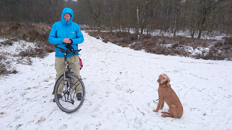 We kiezen weer voor het bekende rondje naar de schaapskooi. Eerst even door het Speulderbos en daar is het gelukkig heel rustig vandaag. Ook weinig MTB-ers overigens en dat loopt wel prettig. We komen tot tweemaal toe een boswachter tegen maar die zegt niets over de hond. Overigens loopt waf gewoon aan de knie dus het valt niet eens op dat er geen riempje aan haar hangt. Maar wel prettig dat we door kunnen lopen. Misschien omdat het rustig is en het ook nog winter is. Geen idee.