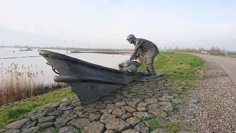 Ik hobbel lekker door het gebied en aan het einde van de lus naar de dijk besluit ik de dijk op te lopen en even buitenom te gaan. Met woefje doe ik dat niet zo snel omdat ze dan aan de riem mee moet draven en dat is voor haar minder leuk. Maar nu ik alleen ben, neem ik die route maar weer eens een keer. Ik loop al snel langs het monument en aangezien ik daar net een rustpauze heb, maak ik een kiekje.