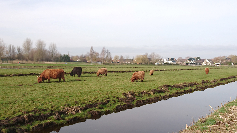 Op de ‘s Gravenweg kijk ik weer om me heen naar alle huizen en wat er verder zoal te zien is en bij de Hooglanders sla ik weer linksaf en loop het natuurgebied weer in. Ik loop eigenlijk veel verder dan ik van plan was maar het gaat prima zo. Ik maak nog snel een kiekje van de Hooglanders. De kalfjes zijn inmiddels al erg groot en zijn dus nog steeds niet weg.