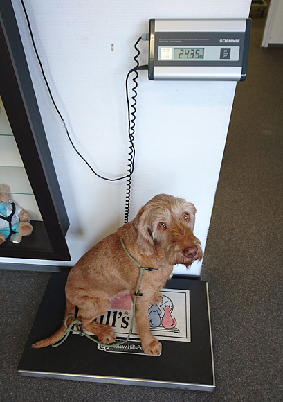 Vanmiddag ga ik weer op pad met wafje voor een kort rondje en vooral voor een weegbeurt. Volgens mij is ze veel te dik en dat is dus mijn schuld als dat zo is. Je ziet het niet echt maar ik weet het vrijwel zeker. Ik gebruik dit korte rondje dan meteen om te kijken hoe het nu gaat met een rondje achter elkaar na onze twee rondjes met tussenpozen van afgelopen dagen. Ik kan dit rondje heel makkelijk langer of korter maken maar ik vertrek voor een 4 kilometer rondje. Ik ben al snel bij de dierenarts en jawel: over de 24 kilo en dat betekent dus eigenlijk gewoon dat madam 5% van haar lichaamsgewicht weer kwijt moet. Die 1.400 gram lijkt weinig maar als je het zo berekent is het natuurlijk idioot gewoon. Ik weet ook wel hoe het komt en dat is dus dubbel dom. Tegenwoordig krijgt ze in de ochtend wat meer zodat ze langer vooruit kan. Maar de middag en namiddag maaltijd moet dus echt een heel stuk minder worden daardoor!