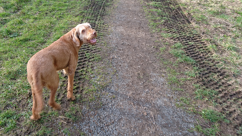 Na de schok van de weegschaal (overigens niet alleen die van haar), lopen we weer terug naar Hitland. Het is prima weer en ik maak een extra lusje omdat het goed gaat met haar. Ze kijkt blij en doet blij.