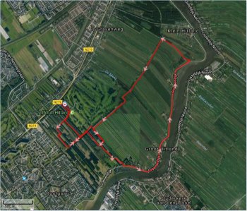 Ik loop de eerste afslag voorbij en ook de tweede en besluit voor de verandering eens bij de trap naar beneden te gaan zodat ik meteen op het pad bij de Nijlganzen uit zal komen. Daar kan woef ook weer los en aangezien ik dat nog nooit eerder heb gedaan zo, is het voor haar ook en afwisseling. Meteen als ik beneden sta bij de trap ga ik weer door met mijn rondje. Continu lopen is weer een prima oefening voor de HM in Edinburgh en als woef het een beetje goed doet kan het ook wel met haar. Ik reken uit hoe lang mijn rondje zal worden en ik besluit te proberen een 7 km continu rondje te lopen op een beetje mooi tempo rond de 6.25 min/km. Grappig genoeg voelt dat vandaag heel comfortabel en makkelijk dus dat is een mooie training.