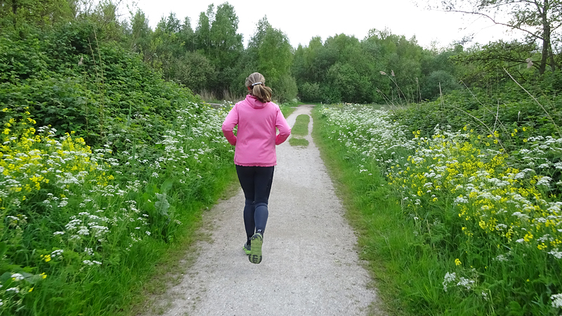 Vandaag heb ik de hele middag zitten studeren voor dat vervelende examen op 24 mei. Maar inmiddels ben ik ijskoud geworden en stijf en wil toch nog wel even wat bewegen. S. is zo lief om met me mee te gaan en tegen half 8 gaan we alsnog op pad voor een rondje. Wafje kan deels in de kar dus dat is prettig. Ik heb geen idee wat ik wil gaan lopen. Continu? Iets met snelheid? Ik ben nog steeds koud en stijf en heb zelfs over mijn giletje een Lafuma jackje aan bij de warming up.