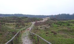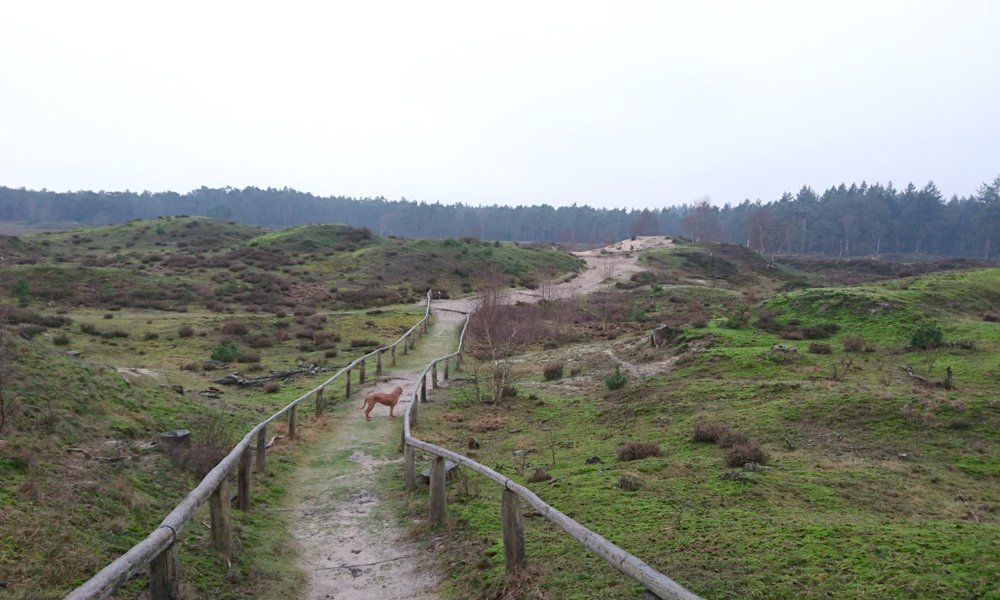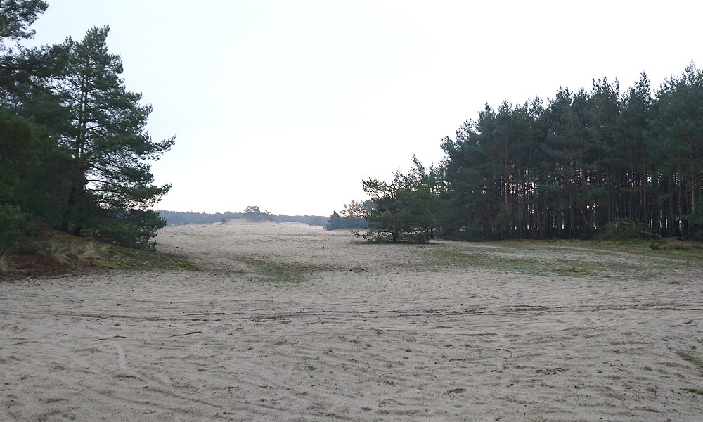 Daarna lopen we verder en kom verderop weer langs een zandverstuiving en daarna door een heel donker bosje met hele dunne stammetjes. Het stuk daarna is prachtig met mooie heide die ik augustus prachtig zal zijn.