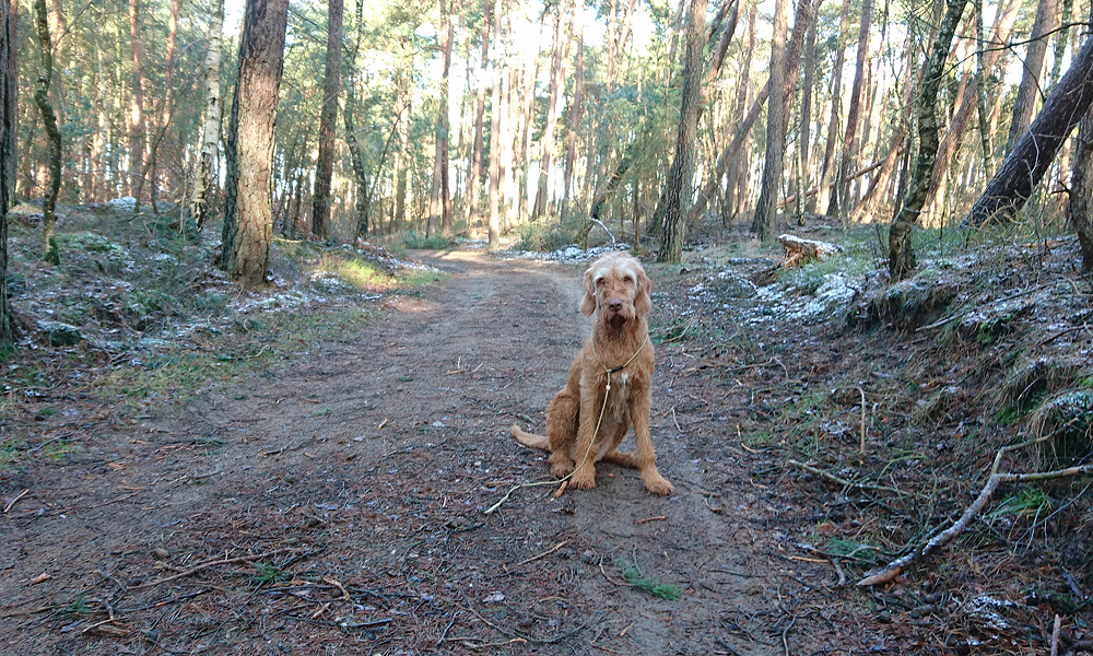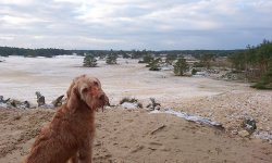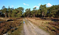 Daarna hobbel ik weer over een pad dat ik ken van een eerder rondje terug naar huis. Linksaf na de zandverstuiving en daarna gewoon over het pad verder. Jammer genoeg is een van de paden bijna niet beloopbaar vanwege diepe plassen en daar doe ik woefje dus ook van de riem omdat ik echt niet weet hoe ik daar overheen moet lopen met haar aan de riem. Zo kunnen we even afzonderlijk van elkaar een weg vinden door de blubber.