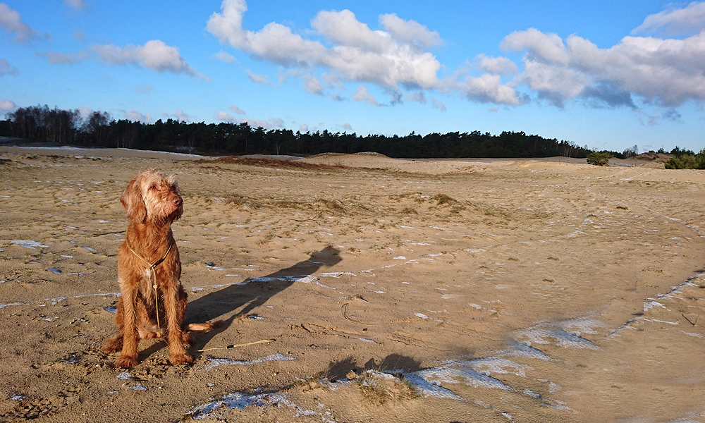 Ik neem een heel stuk dwars over de zandverstuiving maar dat is nog redelijk te doen. Ik stop wel enkele keren en maak een kiekje van woefje in de sahara.