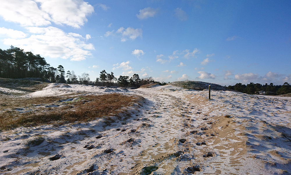 Daarna loop ik langs het hek richting de Klarenweg. Bij de Klarenweg sla ik linksaf maar daarna ga ik meteen weer rechtsaf. Dit pad nam ik nog niet eerder. Tot mijn verrassing is het een heel mooi pad en nu loop ik voor het huis langs dat daar pal op de snelweg staat, verborgen achter een zandheuvel. Ik zie dat altijd half als ik achterlangs loop maar nu zie ik het dus ineens gewoon zoals het staat. Ik hobbel door en een stukje verder zie ik een hoge zandheuvel. Wat zou daar achter zijn?