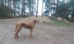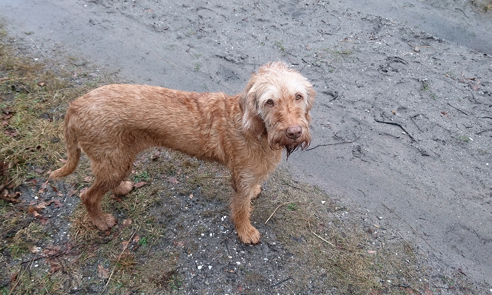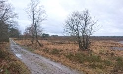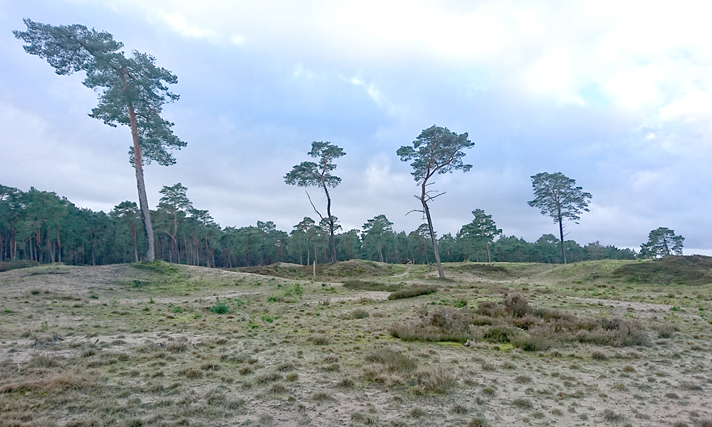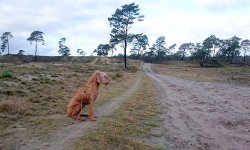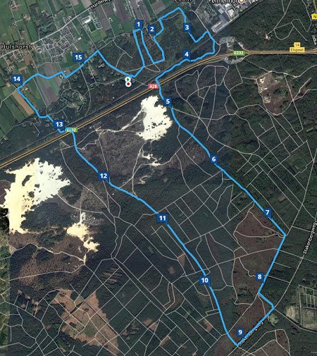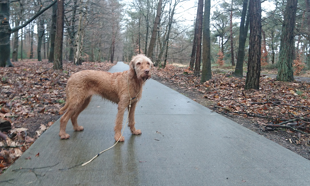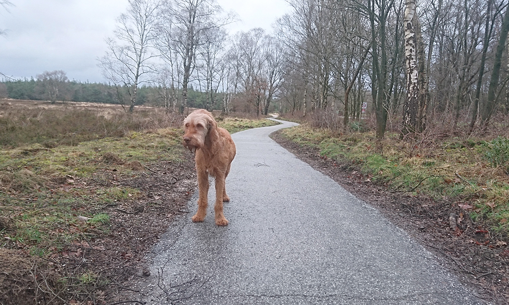 Toch vertrekken we uiteindelijk later dan gedacht maar dat is ook niet echt erg. Wafje is er klaar voor en ik ook. Eerst hobbelen we aan de overkant door het bos. Ik neem een andere route en dat betekent dat ik pas na bijna 5 km bij de zandverstuiving ben. Eigenlijk begint meestal daar mijn route of ik moet vrijwel direct weer teruglopen langs het hek. Maar daar heb ik vandaag geen zin in.
