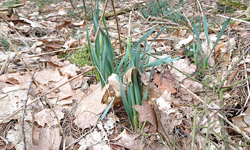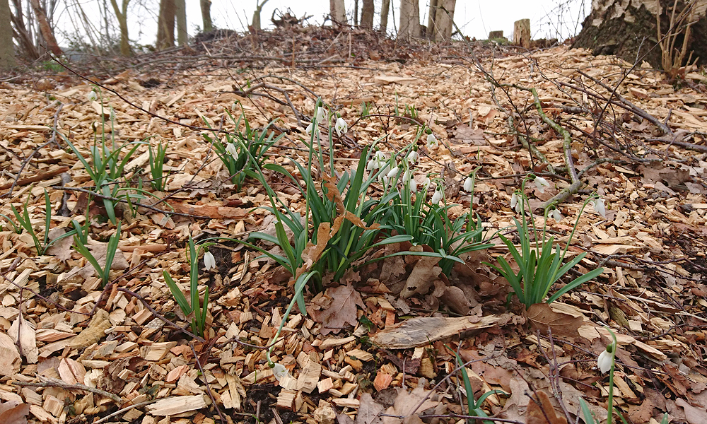 Aan het einde van het pad steek ik de snelweg over en loop naar de zandverstuiving. Woefje is hier weer netjes even aan de riem. Ik maak een kiekje en loop daarna langs het hek weer naar de Klarenweg. Helemaal aan het einde kom ik een dappere dame op en mountainbike tegen. Ik ga door de hekken, steek snelweg en spoor over en hobbel verder. Even over het stukje ‘eigen weg’ van iemand en daarna tussen de weilanden door. Er staan volop sneeuwklokjes.