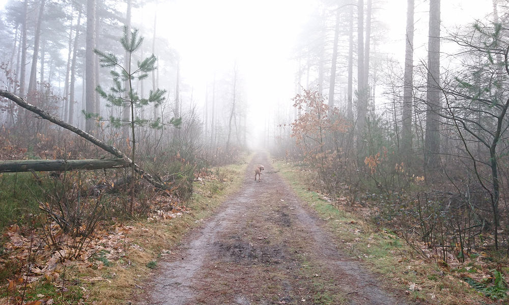 Gisteren heb ik niet gelopen omdat ik eerst naar Haarlem was voor rug en heup en daarna 3 transporteurs kon ontvangen en dus de deur niet uit kon. Maar vandaag gaan we meteen op pad. Ik ben om 7 uur op, doe wat dingen op de computer en vertrek daarna meteen. Het is mistig en koud als ik vertrek maar achter de mist lijkt een zonnetje te zitten. Aan de overkant in het bos raak ik even aan de praat met iemand anders die een hond en een kindje bij zich heeft. Ik ga gauw verder want ik wil vandaag echt even opschieten met mijn run.