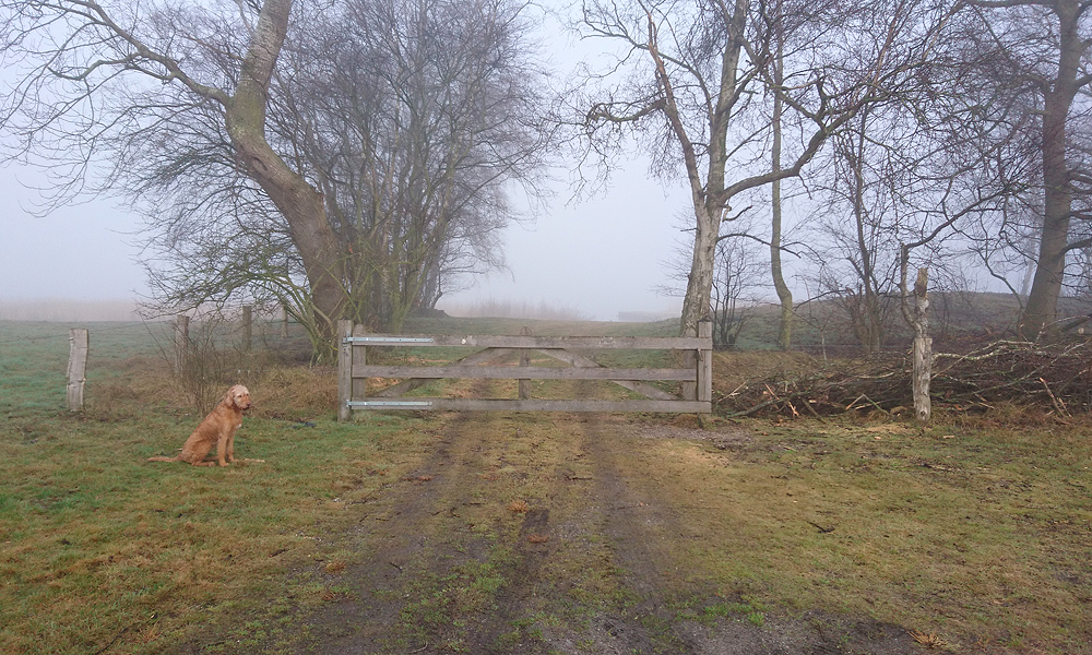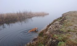 Na het badderen kies ik voor de langere route en sla rechtsaf. Rechts van me zitten normaal ganzen maar vandaag hoor ik ze wel maar zie ze niet vanwege de mist. Het ziet er allemaal heel anders uit vandaag. Echt een klein wereldje. Ook het geluid is anders vandaag. Alles lijkt gedempt door de mist en wind is er ook al nauwelijks.