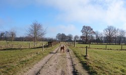 Ik loop verder en daar mag woefje ook weer lekker los. Zo is dit rondje zowel voor mij als voor haar leuk omdat ze het grootste deel los kan lopen en ik een beetje lekker door kan lopen. Als we door het weiland lopen, is de zon inmiddels helemaal doorgebroken. Het is gewoon warm nu.