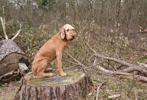 Gisteren hebben we gelopen en vandaag vertrekken we ook voor een rondje. Maar ik kom dus echt totaal niet op gang. Ik wandel een heel stuk en eigenlijk is het hele stuk meer wandelen dan iets anders. Ik wandel wel fors door zodat het nog ergens op lijkt. Woef is ook een beetje sloom en samen hobbelen we door het bos aan de overkant. Ik neem het pad langs het spoor en maak een kiekje van woefje op de boomstronk.