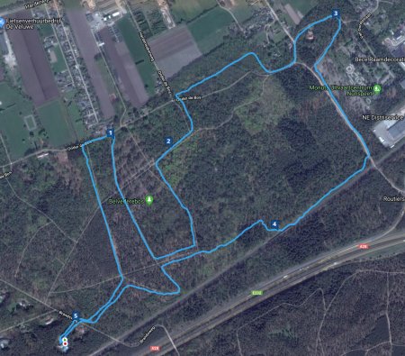 Even verderop denk ik een pad te nemen maar dat komt nergens uit en samen kruipen we door de bossages terug naar het pad dat we normaal ook nemen. In de verte zie ik een groepje van 3 mannen die ik eerder al zag hardlopen. Zij wel. Het is veel warmer dan ik dacht en mijn winterbroek kan nu echt d kast wel in. Van de 3 mannen heeft er ook nog eentje een lange broek aan. De rest loopt al in het kort. Zou wafje het ook warm hebben misschien? Hoe het ook zij, ik ban na 5 km weer terug bij huis. Nou ja, woef moest toch uit zullen we maar zeggen. Op naar de volgende ronde maar weer.