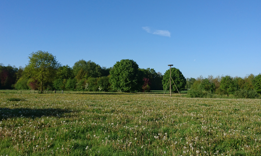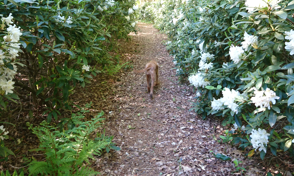 Vandaag ga ik weer met wafje op pad. Ik ben eigenlijk best laat want we vertrekken pas om 8.30. Het huis is nog doodstil. R. slaapt hier en had gezegd dat ze wel rond 6.00 uur op ging staan en dan in de tuin zou gaan zitten. Nou nee dus want het is gewoon nog doodstil. Die zie ik straks dus wel als ik thuis kom. Eerst lopen met wafje nu. Het gaat eigenlijk heel goed met haar gelukkig. Ik ga dus eens kijken hoeveel ze mee kan lopen. Ik let gewoon op haar, en volg de route die zij neemt. Het gaat super traag want ik kijk steeds of ze niets pakt uit het bos en of het allemaal goed gaat maar het is zo fijn om haar weer zo bezig te zien! We lopen eerst maar eens een rondje rond de Steigerberg. Ze is immers ook loops en de kans dat ik daar mensen met een reu tegen kom is kleiner. De Rhododendrons staan al mooi in bloei. De witte komen dus eerder uit dan de roze weet ik nu. In het veld waar voorheen koeien stonden, bloeien nu allerlei leuke wilde bloemen. Ik vind dat wel een fraai gezicht zo. De ooievaarspaal staat er leeg en verlaten bij.
