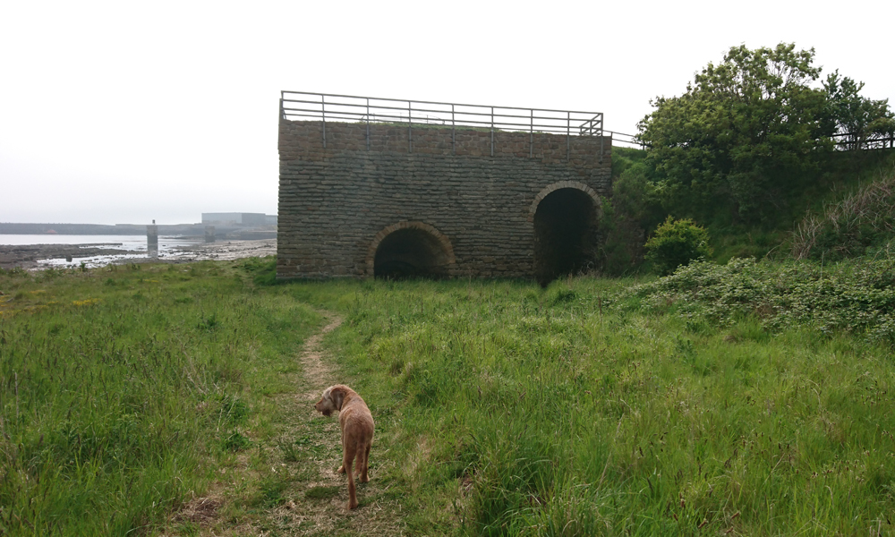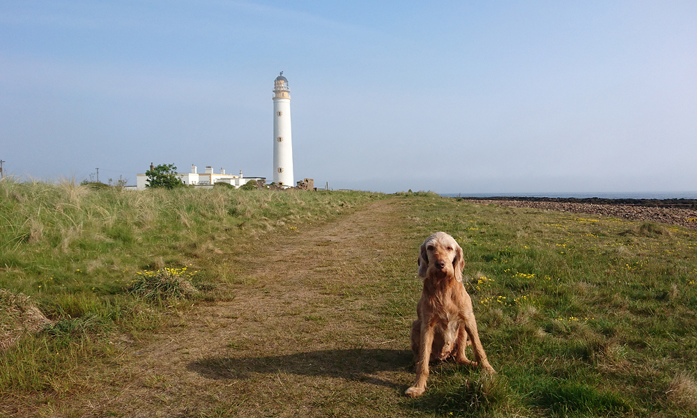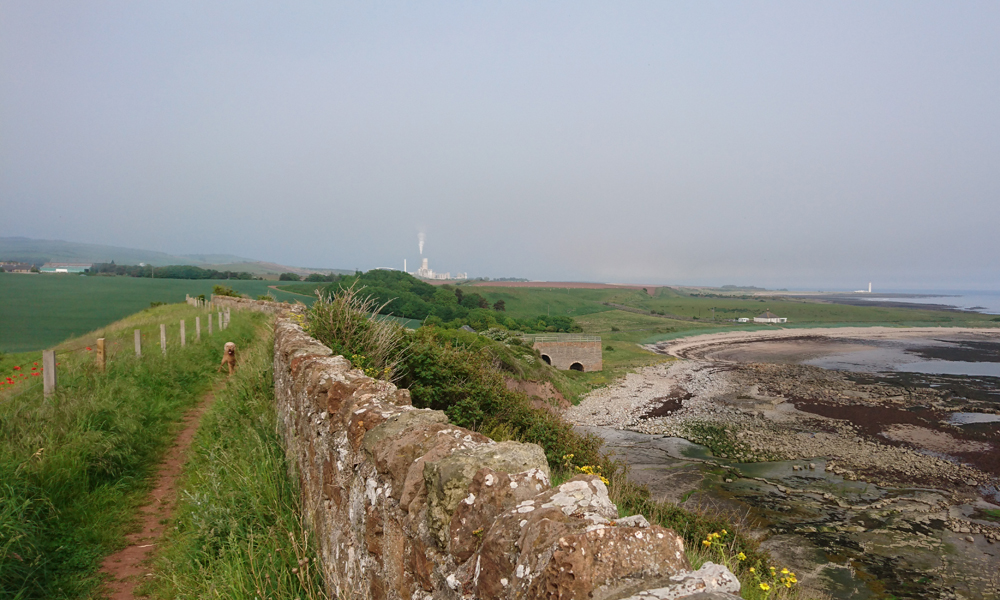 We hobbelen rustig langs de vuurtoren en langs het water. Deze keer heb ik totaal geen last van de stenen op het pad. Vreemd is dat eigenlijk dat het nu helemaal niet vervelend voelt allemaal en prima beloopbaar is terwijl het pad natuurlijk hetzelfde is als de vorige keer. Maar het is blijkbaar zo dat wanneer dingen pijn doen en de keten verbroken is van het normale gangwerk, dit soort dingen dus niet prettig meer zijn omdat er niets opgevangen of gecompenseerd kan worden. Heel snel zijn we dus deze keer weer bij het weiland richting het powerstation en over de weg erlangs. Alles gaat prima. Wafje kreeg op 4 km al water en ik vulde de softflask zelfs al bij op de toiletten bij de lime kilns. Het is ook zoveel warmer dan voorgaande dagen dat ik het we begrijp. Op het pad langs het powerstation twijfel ik even of het niet te ver wordt voor woefje maar ik kan nu beter doorlopen zodat ze straks lekker het water in kan in de zee verderop.