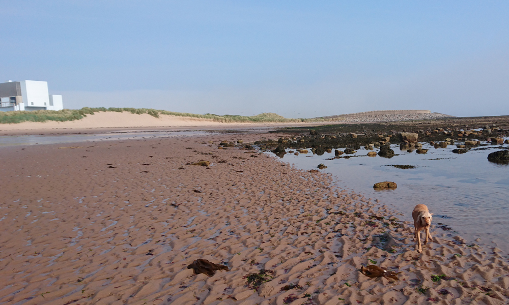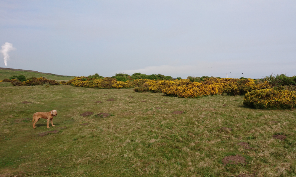 Als ze klaar is met badderen gaan we weer terug. Over het strand, door de duinen en weer langs het powerstation. Ik kom nog iemand tegen met twee hondjes en moet woefje even aanlijnen omdat de hondjes bang zijn. Ook prima en al snel zijn we weer op pad. Ik maak nog een kiekje op het pad naar de lime kilns die in de verte al te zien zijn. Als je heel goed kijkt is het lighthouse ook te zien en…. die vreselijke cementfabriek die vandaag weer een witte rookpluim uitstoot.