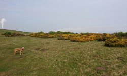 We hobbelen verder en gaan weer via het grasland met de heerlijk ruikende gaspeldoorn verder terug richting de auto. Ik vind het geel prachtig en de geuren zijn heerlijk. Jammer dat je dat niet vast kunt leggen. Vandaag heb ik gelukkig wel uitzicht op de vuurtoren dus weet ik waar ik ongeveer ben. Vorige keer zag ik niets door de laaghangende mist.