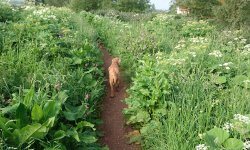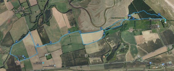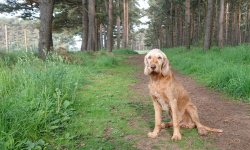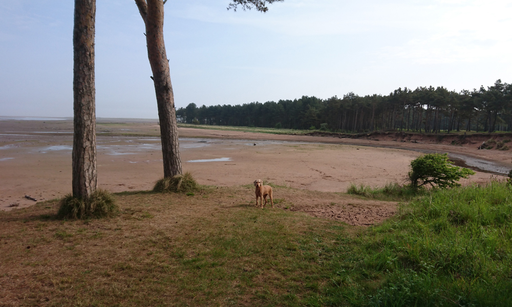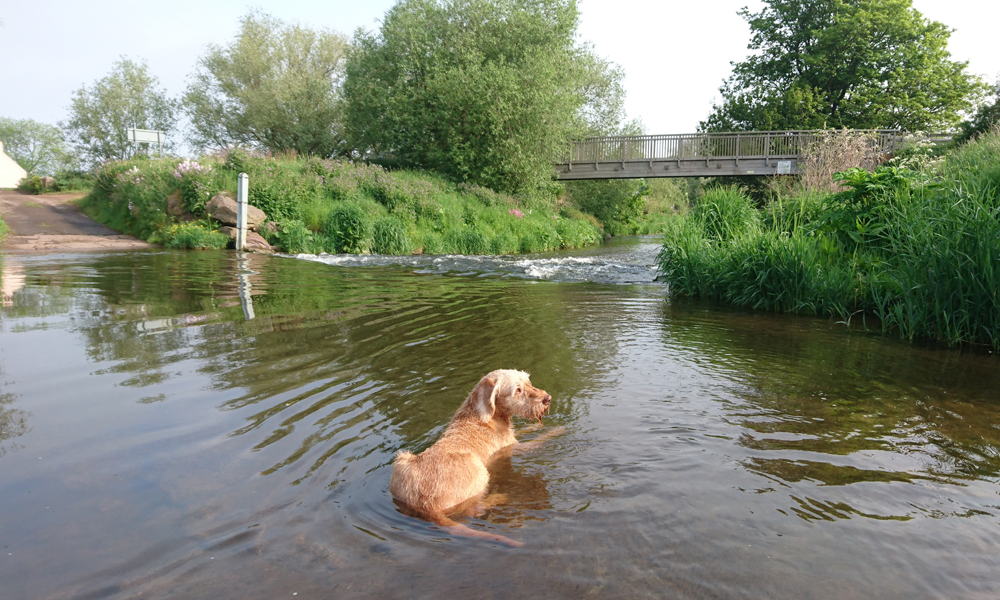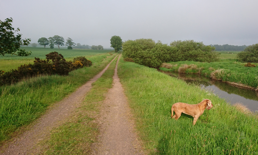 Vandaag zie ik al vanuit mijn bed dat het heel zonnig is. Ik spring er dus uit en om 7.15 zit ik al met wafje in de auto voor een run. Te warm is echt niks voor haar dus gauw op pad en zien waar we kunnen komen samen. Ik kies voor vandaag weer voor het east link family park maar dan wel bij de parkeerplaats van het park zodat ik niet eerst de 1.500 mtr erheen hoef te hobbelen door de duinen. Ik wil vandaag namelijk eigenlijk naar het ford richting east linton lopen waar ze kan badderen en waar we weer via een andere lus terug kunnen keren. Ik zocht dat gisteren even op en dat lijkt een prima rondje. Ik wachtte nog even af of S. al wakker is en misschien mee wil maar uiteindelijk ga ik dus toch alleen. Eigenlijk is dit ‘ons’ rondje. Hij fietste altijd mee op dit rondje maar vandaag dus even met wafje op stap. Het is inderdaad warm. Ik heb mijn korte rokje weer aan omdat mijn benen nu wel weer goed voelen en de lange tight ook veel te warm is. Ik ben benieuwd of het pad langs het water nu ook weer gewoon beloopbaar is voor me. Net zoals het pad bij de vuurtoren gisteren ook weer prima te doen was. We hobbelen eerst door het bos en daarna langs het water. Dat gaat nu allemaal prima en we schieten ook goed op. Aan het einde van het pad slaan we dus nu niet linksaf maar rechtsaf en lopen over een breed pad weer verder. Het is echt zonnig inmiddels maar woefje doet het goed. Water wilde ze trouwens niet.