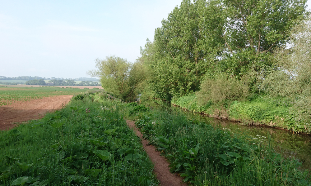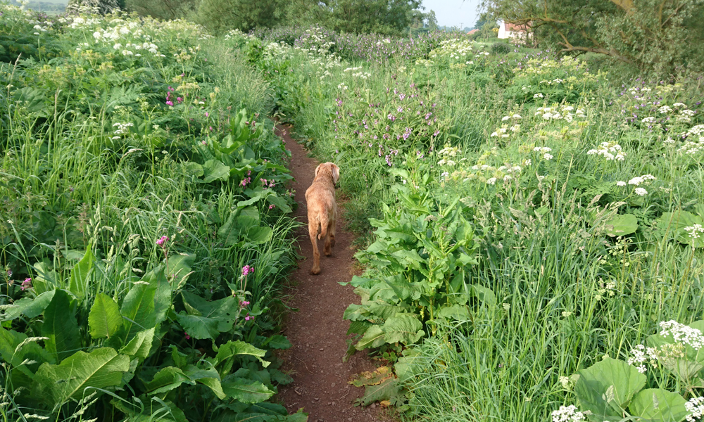 Ik vind het wel weer leuk om hier te lopen en de kilometers gaan ook snel. We hobbelen over het pad en slaan rechtsaf langs een weiland parallel aan de weg. Daarna onder een bruggetje door langs het water. Dit is altijd een heel mooi pad met mooie bloemen links en rechts. We hebben hier wel eens een dipper gezien maar het is nu stil. Heerlijk lopen!