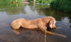 Verderop kom ik iemand tegen met 3 honden die volop aan het telefoneren is en geen aandacht heeft voor de honden. Ze zijn lastig voor woefje maar gelukkig zijn we sneller dan de dikkerds en hebben we er geen last meer van. Op naar het water nu zodat ze lekker even kan afkoelen. Omdat ik niet weet hoe sterk de stroming is, doe ik haar eerst even aan de riem. Ze loopt meteen het water in! Ik maak haar daarna los en dan gaat ze op haar gemakje even voor zeehond spelen. Ik kijk rustig om me heen en geniet van het plekje. Er is gelukkig niemand.