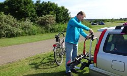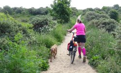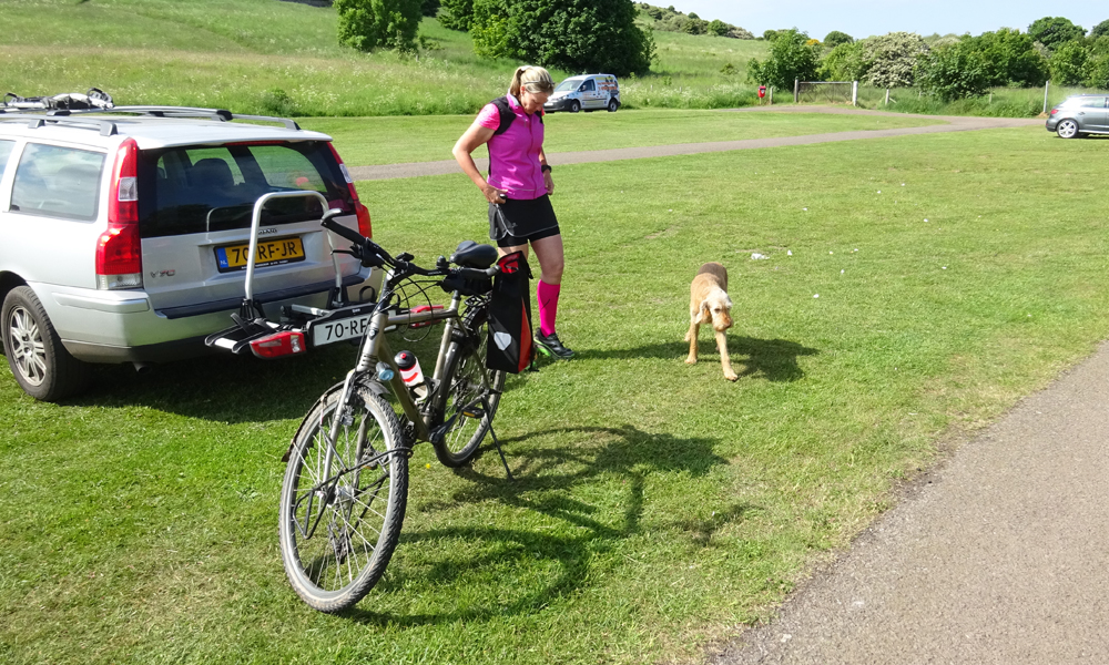 Als we ons ijsje op hebben, besluiten we de fiets op de auto te zetten. Door de duinen wordt toch niks meer en inmiddels heb ik ook geen zin meer om te lopen eigenlijk. Ik trek mijn jasje aan om niet teveel af te koelen, zetten de fiets op de auto en gaan weer terug naar de duinen. Leuk voor woefje!