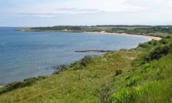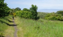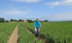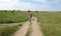 Jammer genoeg kunnen we met de fiets nergens komen en lopen we al snel weg bij de zee en richting de golfcourse. Dat was nou net niet de bedoeling. Geen mooie vergezichten meer en ook geen fijn pad voor woefje. Kunnen we nou wel over die verrekte golfcourse met de fiets of is dat helemaal niet de bedoeling? We zoeken meer dan we lopen en het is eigenlijk gewoon irritant. Woef vindt er ook niks aan en het is nog warm ook.