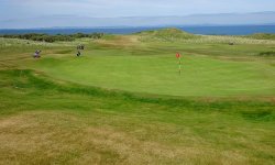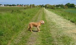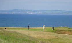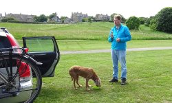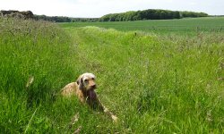 We kijken op de kaart en dwalen over de golfcourse. Waar is nou het pad dan? Uiteindelijk vragen we maar iets aan golfers die ons vriendelijk te woord staan en ons niet wegsturen of onhebbelijk doen. Je mag over de golfcourse maar ze weten niet zeker of honden bij de volgende golfcourse ook zijn toegestaan. We kijken op de kaart en we besluiten maar iets anders te gaan lopen dan. Terug naar Gullane dan maar, daarna naar Saltoun castle en dan lekker naar de zee voor woefje. Dit wordt niks geloof ik. We lopen dus maar verder en geven woefje ergens in de schaduw wat te drinken. Dit was niet de bedoeling want voor haar is er geen bal aan op deze manier.