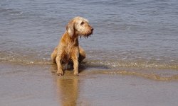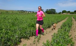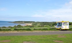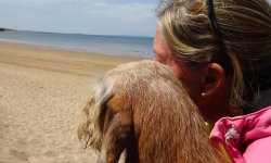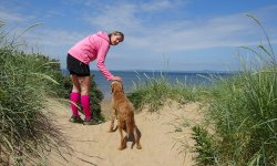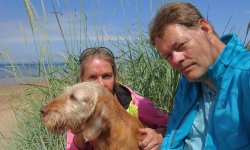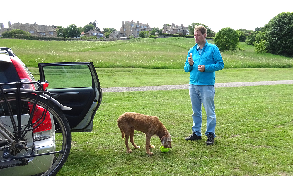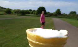 Als we terug lopen, stelt S. voor om nog een ijsje te nemen. Nog zo/n duur ijsje? We doen het en al snel smikkelen we van ons softijsje. Goeie business daar dat is duidelijk. De run was geen succes maar het was wel mooi aan het begin en ook gezellig en woefje vond de zee helemaal leuk. Deze trip zijn we niet succesvol geweest met meefietsen dat is wel duidelijk. Vorige keer met de kar op de heuvels en nu weer bij het strand. Morgen de laatste korte run voordat we vertrekken. Gewoon makkelijk rond het huisje dan maar!