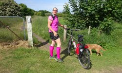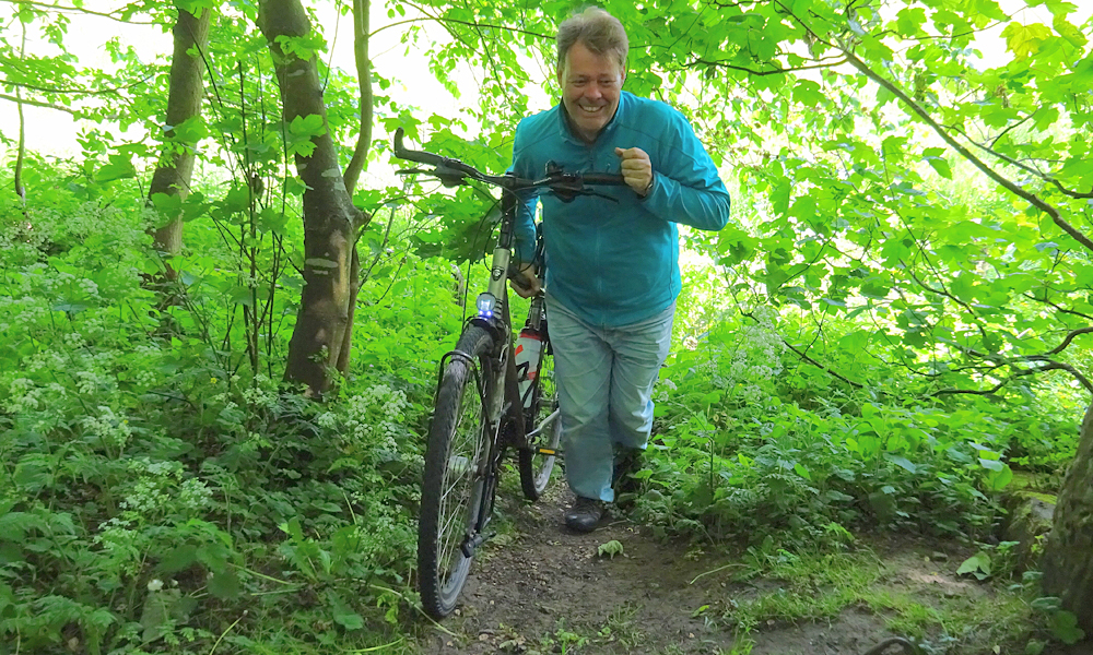 Nadat we foto’s gemaakt hebben, kiezen we weer een verkeerd pad. Het begin is prima te doen richting de bosrand maar daarna is het even klunen om weer op het juiste pad te komen. Wat deed ik daar nou fout? Op de kaart staat echt een normaal pad aangegeven en met de fiets is dit niet handig. Ik merk dit soort dingen natuurlijk ook niet tijdens lopen omdat ik dan overal gewoon kan komen.