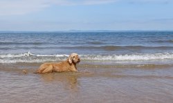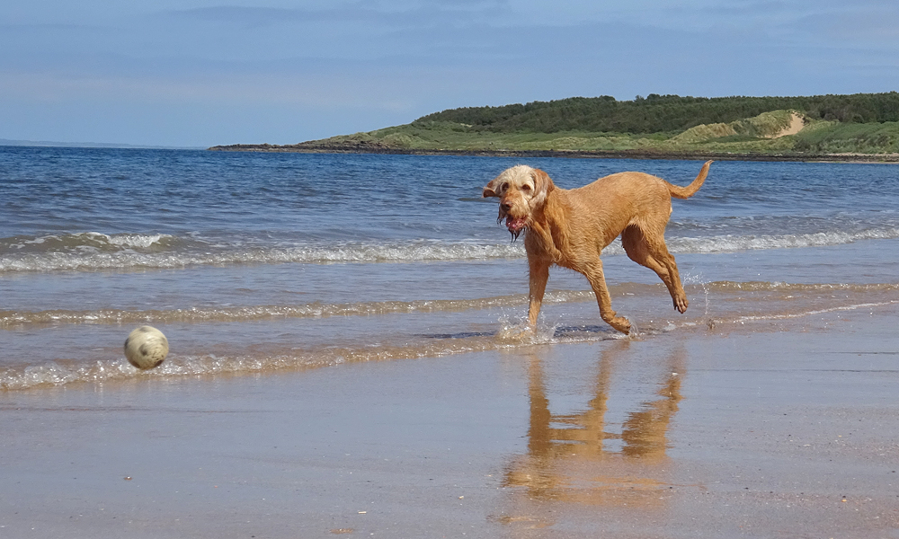 Maar even later zijn we dan toch op het strand. Lekker even voor woefje dan maar spelen met een balletje en lekker badderen.