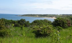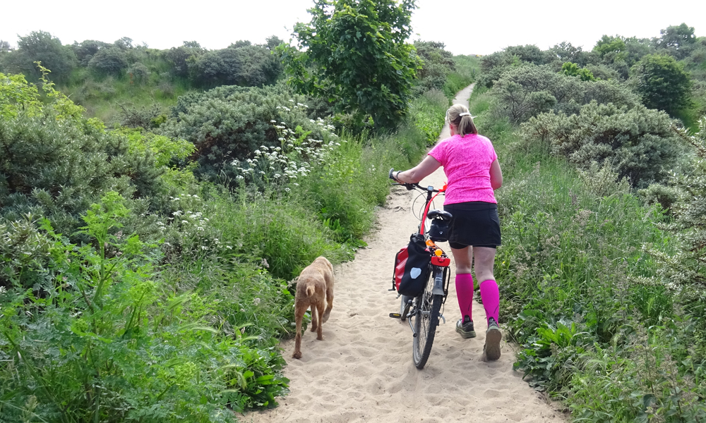 We starten vanaf de parking bij het strand. Woefje moet nog even wachten met badderen omdat ze anders meteen nat is en misschien stijf wordt. Eerst door de duinen dus en daar gaat het al snel mis. S. moet nog even iets uit de auto halen (zakdoekjes geloof ik) en daar verliezen we meteen al tijd. Daarna gaan we op pad en zoeken een geschikte route voor de fiets. Prachtig is het wel zo boven de zee!