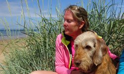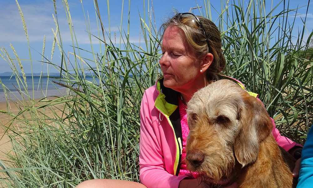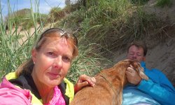 Nadat we wat gespeeld hebben, kruipen we een duinpan op om uit de wind een beetje in de zon te gaan luieren. Wafje vindt dat allemaal prima natuurlijk en als we uitgeluierd zijn gaan we nog een keer naar de zee.