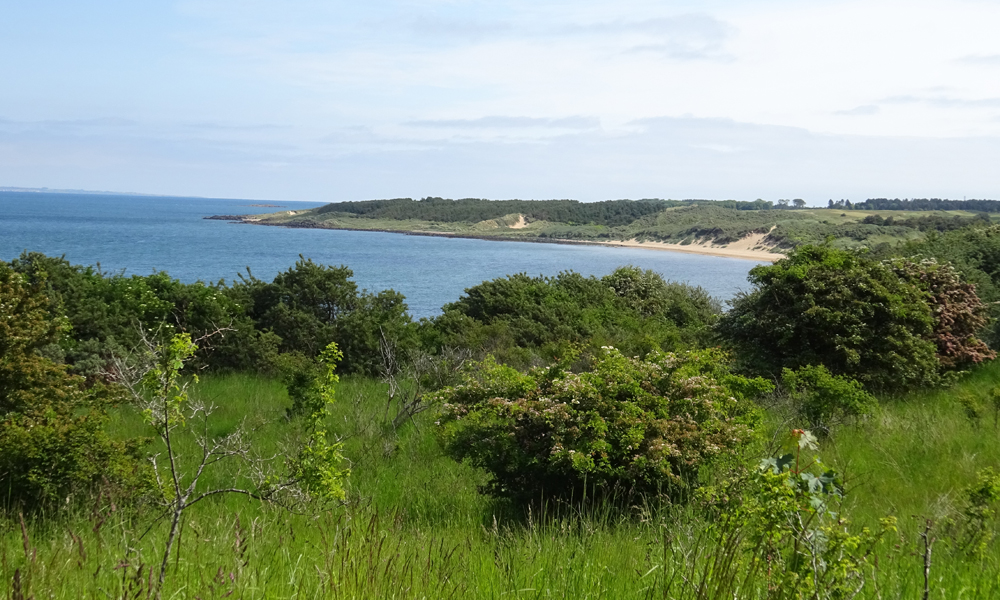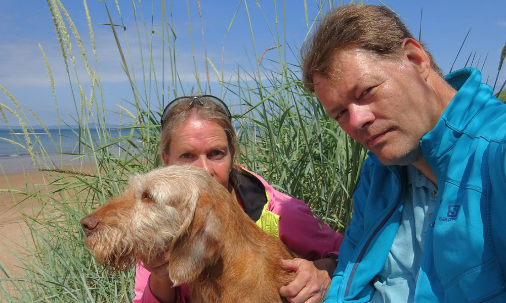In Gullane lopen we langs het kerkje en daarna gaan we riching het water en de duinen. Zullen we kijken of we ergens door de duinen nog een stukje kunnen lopen dan? Over het strand gaat niet met de fiets maar misschien zijn de duinen wat. S. gaat vast vooruit om uit de auto balletjes en werpstok te halen. Ik neem het grote pad richting het strand alvast met woefje. Als ik niet snap waar hij blijft, loop ik terug en zie hem ergens door het duinzand ploeteren met de fiets. Wat doet hij daar nou? Blijkbaar het pad gemist en ik dacht echt dat hij wel gezien had dat het normale pad naar het strand even verderop lag. Niet dus. Hij baalt.