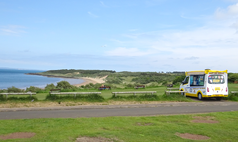 Als woefje uitgespeeld is, lopen we terug naar de auto. Ik duw de fiets dan maar even over het zand. Als we boven komen, blijkt er een ijscowagen te staan met softijs. We nemen een peperduur ijsje maar het is wel lekker.