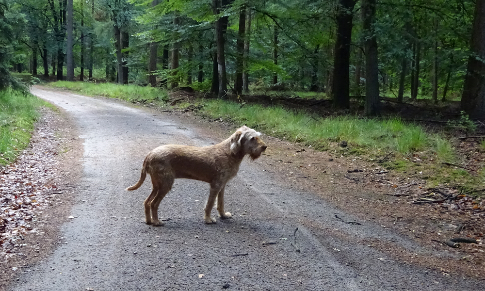 Gauw weg en verder het bos in richting de vennetje van het Ronde huis. daar staat zowaar nog water in maar woefje mag er niet in en ook niet uit drinken.