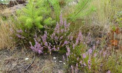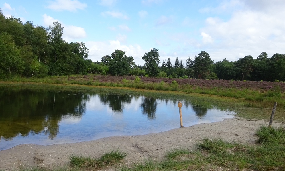 Ik weet deels de weg gelukkig en weet zelfs waar ik linksaf moet slaan richting het Mosterdveen. Dat valt niet tegen eigenlijk. Vorige keer moest ik echt nog op de kaart kijken. Maar nu loop ik er zo heen en herken ik het ook. Niet rechtsaf want dan kom ik bij Samoza maar linksaf. dar zijn ook al de eerste vennetjes te zien. Het blijft mooi hier. Her en der doet de heide zijn best om paars te bloeien ondanks de droogte.