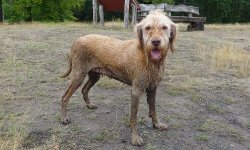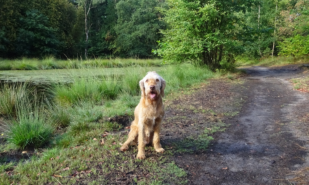 Ik hobbel door en besluit even naar het grootste vennetje te gaan. Woefje vindt het meteen leuk en loopt het water in. Dat is op zich best ware het niet dat ze ergens denkt eruit te kunnen komen en zo de modder in loopt waar ze met moeite weer uit komt. Ze schrikt ervan en komt met moeite het water uit op een rare steile plek. Ze ziet er niet uit en stinkt een uur in de wind. Dat was niet de bedoeling en ze wil ook het water niet meer in. Straks even de Waschkolk dan maar in.