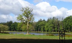 Verderop zie ik nog grote eikels aan de boom hangen. Kennelijk zijn er toch bomen die het voor elkaar hebben gekregen om de eikels vast te houden en te laten groeien. Door de droogte zijn de meeste eikels al als halve dingetjes gevallen. Geen goed nieuws voor de dieren dus maar dit ziet er goed uit. Verderop loop ik weer langs het landgoed de Roosteeg. Ben nog steeds benieuwd wie daar nou woont. Ik zie notabene iemand lopen met 2 hondjes. Zou hij daar wonen? Geen verkeerde plek daar met al die grond en het mooie watertje.