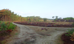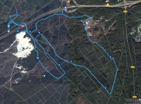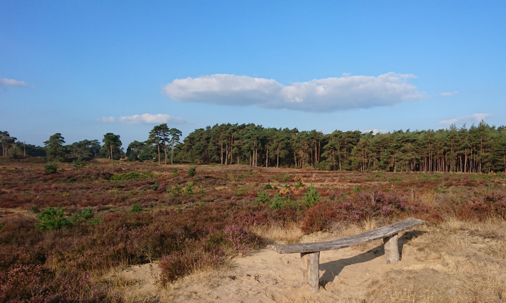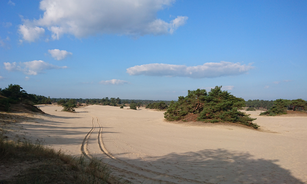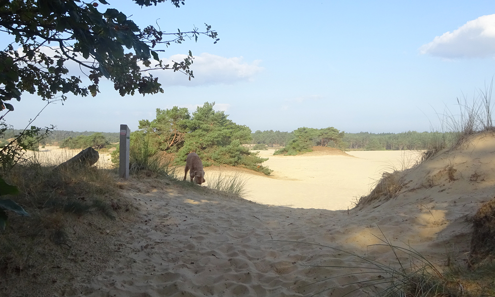 We lopen eerst het bekende rondje door het Willembos en lopen daarna nog een extra lus terug over het ruiterpad. Dat is zwaar maar wel mooi en woef vindt het ook leuk. Daarna steken we het fietspad over en gaan rechtdoor weer terug over de heide met het zandpad. Maar deze keer niet linksaf aan het einde zoals de vorige keer toen we weer in het rulle zand terecht kwamen, maar gewoon verder terug richting het fietspad. Dat loopt prima en is een mooie extra lus. Aanvankelijk volg ik het bordje met de wandelroute maar die gaat rechtdoor omhoog de zandverstuiving op. Daar klimmen we wel naar toe en daarna kijk ik even over de grote vlakte. Mooi vanaf hier en een heel ander uitzicht dan de plek waar we normaal staan te kijken.
