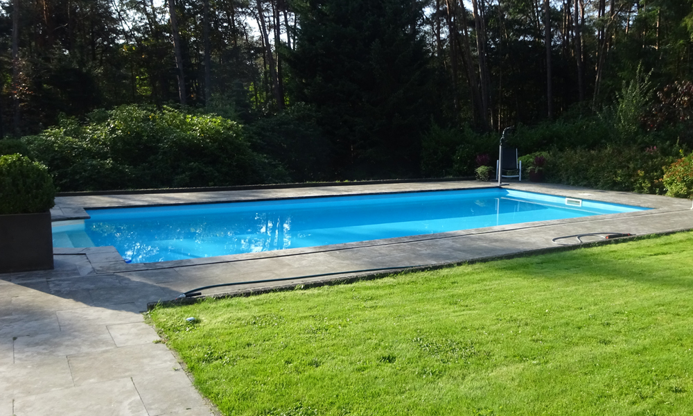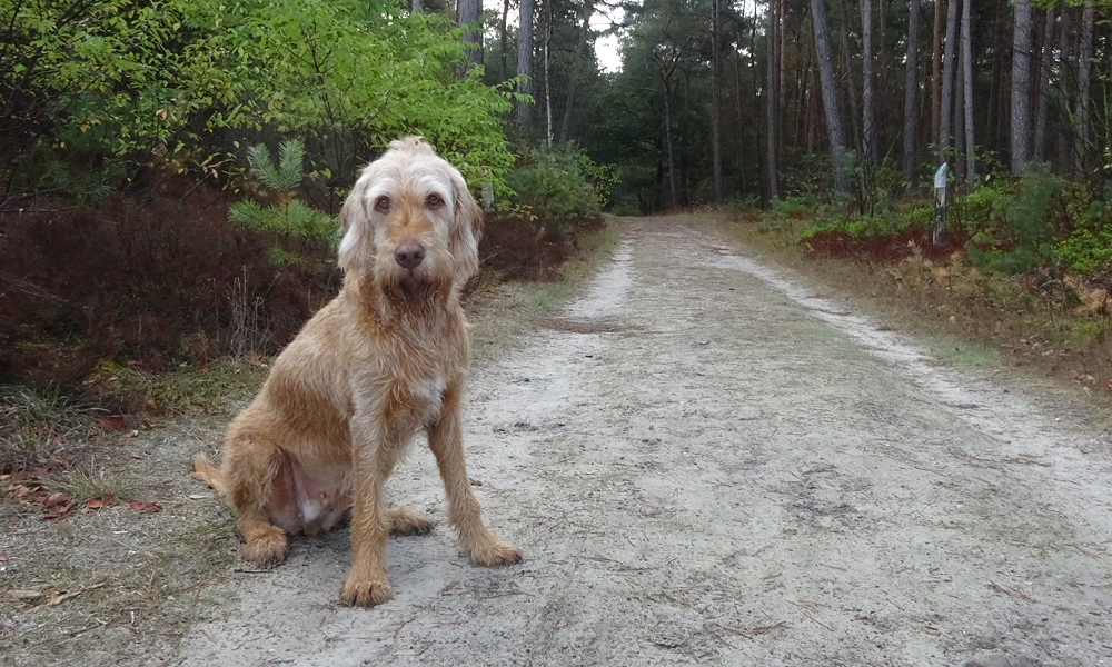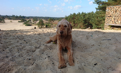 Op de zandverstuiving kijk ik ook nog even bij het uitzichtspunt en ik probeer te ontdekken waar we net nou stonden. Dat zou toch makkelijk te zien moeten zijn vanwege de sporen van de auto die daar net waren maar ik zie het niet goed. Woef vindt alles best en wacht af totdat we weer verder gaan. We hobbelen het laatste stukje terg en na 12 km staan we weer voor de deur. Dat zwembad ziet er wel heel aanlokkelijk uit…..
