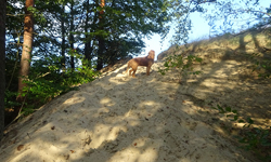 We hobbelen weer naar beneden en woef doet veel te wild en bezeert zich bijna tijdens het spelen met een grote tak in het zachte zand. Ze is in ieder geval nog niet moe en helemaal happy dat is duidelijk. Daar word ik helemaal blij van natuurlijk.