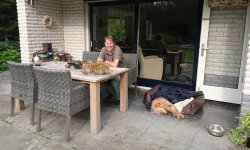 Inmiddels is het weer ook wat opgeknapt. Het zonnetje komt voorzichtig tevoorschijn en aangezien S. een thuiswerkdag heeft, kunnen we samen buiten even ontbijten na ons 11,5 km rondje.