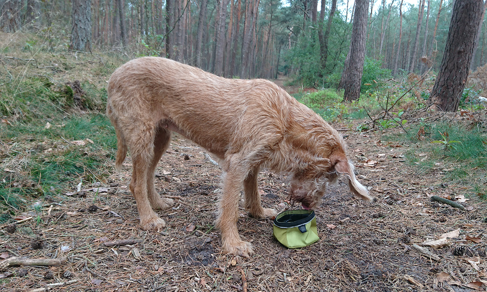 Op 4 en 8 km krijgt woefje lekker water te drinken en dat wil ze wel.