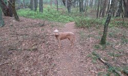 Vandaag vertrek ik voor het eerste rondje meteen met woefje. Ik geef nog even de vissen eten en woefje speelt voor reiger. Het is even voor 7.30 als we door het bos lopen. Ze lijkt er echt zin in te hebben, heeft zich al volop uitgerekt en loopt nu vrolijk voor me uit door het bos aan de overkant. Na het korte plasrondje steken we het spoor over en gaan naar het Willembos.