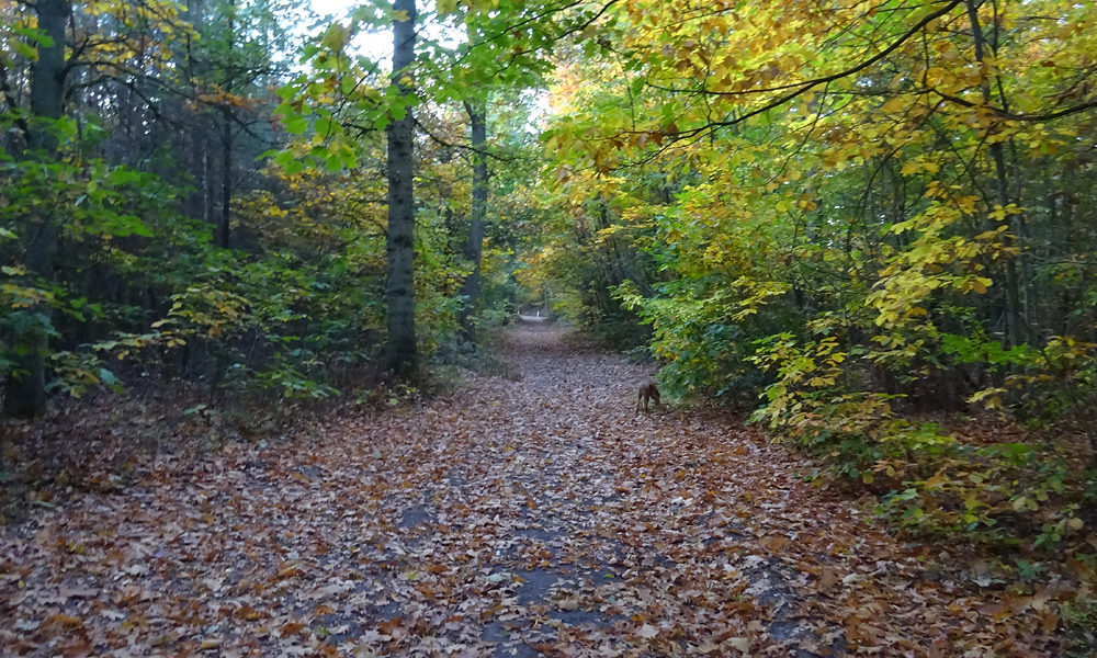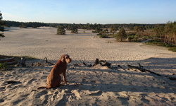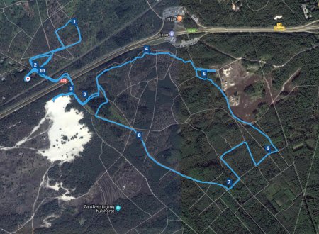 Verderop laat ik woefje drinken en ga ik daarna rechtsaf en niet door naar het fietspad. Ik loop het lusje daar en loop via hetbrede pad weer terug naar de zandverstuiving. Vreemd genoeg kom ik toch op een rondje van ruim 10 km uit terwijl ik dacht dat ik een kortere route zou lopen op deze manier. Precies goed en het liep ook prima.