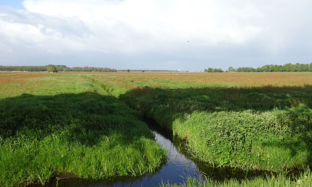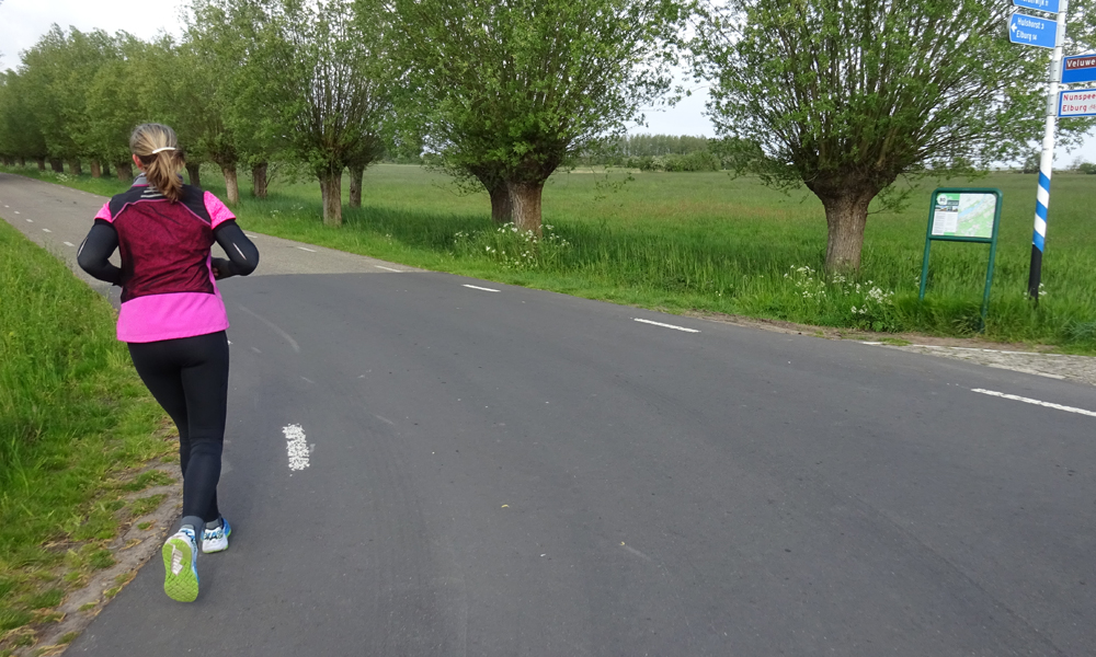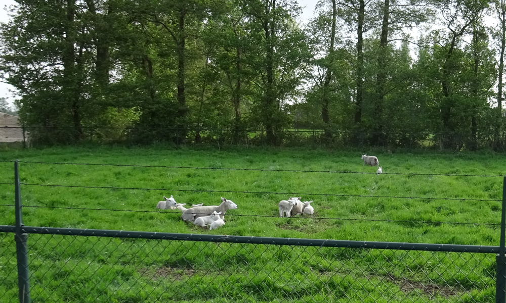 Gelukkig hebben we nu een stukje de wind mee en dat loopt een beetje sneller en beter. We besluiten via het tuincentrum te lopen voor een extra lusje. Uiteindelijk gaat Fleur zelfs eventjes liggen maar wel heel kort. Als ze nou eens snapt dat dat lekkerder is en dat ze dan ook om zich heen kan kijken….. Bij het stukje land waar Arjen zijn plantjes had staan, grazen nu lammetjes. Ook leuk.
