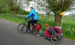Ik ben echt enorm sloom want sinds mijn eerste loopje in mei op 1 mei liep ik niet meer en zwom ik ook nog niet. Ik was op 3 en 4 mei wel op pad voor een rondje te zien aan mijn garmin gegevens maar maakte het dus niet af na de wandelingen met de hondjes. We werken ons te pletter in de tuin omdat er nogal wat plantjes geplaatst moeten worden. Maar vervelend is het wel. Vandaag gaan we dan wel op pad. Eerst even met beide dames een plas rondje en daarna twijfelen we even wat we moeten doen. Met Fleurt? Met Ziva? Uiteindelijk kiezen we voor een nog betere oplossing. Ik kies voor een langere wegronde en we nemen Fleur mee in de doggyride om te oefenen. We willen haar ook in de open kar meenemen maar dat moeten we wel oefenen. Vorige keer was ze aan het schuren langs de bovenrand en ging ze steeds staan. Nu besluiten we gewoon niets te zeggen en te kijken wat ze eigenlijk doet. Aanvankelijk gaat ze dus ook schuren maar dat dooft al snel uit. Ze gaat wel af en toe staan en rondkijken maar heeft niet echt de neiging om eruit te stappen. Ik ben benieuwd of ze deze keer wel een keer zal gaan liggen. Voorlopig zeg ik niks maar let ik alleen op. Het lopen gaat eigenlijk best aardig en mijn heupen voelen ook goed. Ondanks (of dankzij) het gedoe in de tuin! dat is wel fijn in ieder geval. Het is wel koud en ik heb mijn compressie handschoentjes aan. Het eerste stuk over de Bredeweg hebben we de koude wind van schuin voor. Het valt nog niet eens mee maar ik doe mijn best. Daarna slaan we linksaf. Fleur doet het goed in de doggyride en kijkt om zich heen maar stapt niet uit.